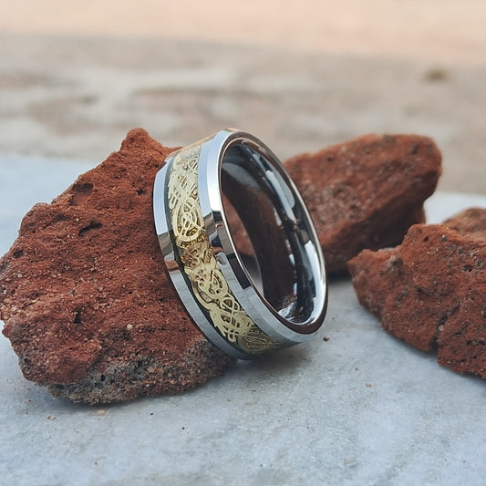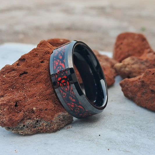 8mm Black Tungsten Ring for Men with Red Celtic Dragon Inlay. Durable and stylish wedding band or accessory, ideal for any occasion