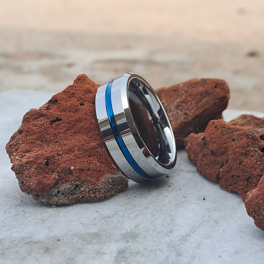 8mm Tungsten Ring Blue Line Inlay Men Silver Polished Wedding Band - Stylish and Durable Choice for Weddings and Everyday Wear"