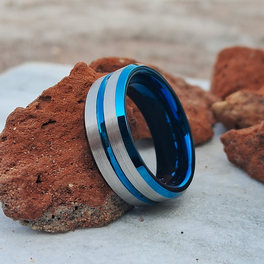 8mm Tungsten Ring Silver Brushed Thin Blue Line Inlay Men Engagement Bands, Blue Wedding Ring | Anniversary Ring | Silver Tungsten