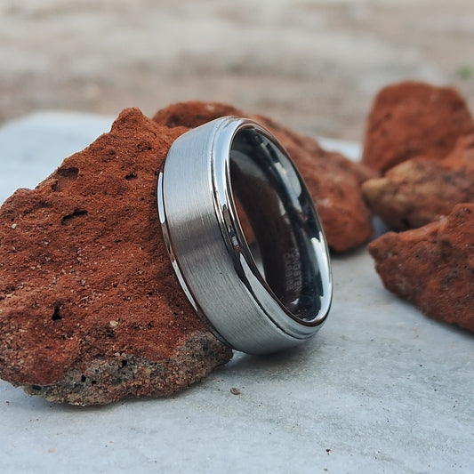 8mm Silver Tungsten Ring for Men–Durable with Mechanical Seal Inlay. Sleek and Unique Design, Perfect for Everyday Wear or Special Occasion