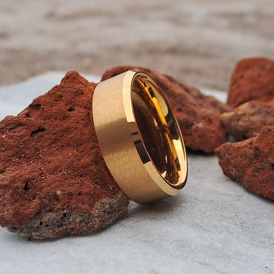 This 8mm 24K Gold Plated Tungsten Ring, featuring a sleek brushed finish, offers a stylish and durable choice for men’s wedding bands.