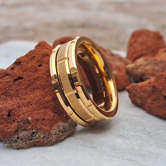 This 8mm Gold Tungsten Ring features a unique mechanical seal inlay, combining durability and style for the modern man Free Custom Engraving